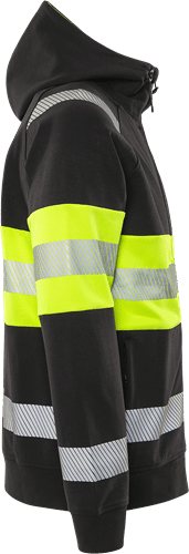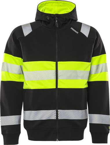 Organic cotton and recycled material / Double face stretch material / Segmented reflective tape for better freedom of movement / Adjustable hood / Full-length front zip / Inside chest pocket with zip / 2 front pockets with zip / Rib-knit cuffs and hem / Approved according to EN ISO 20471 class 1 and EN 13758-2 UPF 40+ UV protection. Material approved UPF 100+ UV protection / Certified after 25 washes / OEKO-TEX® certified.