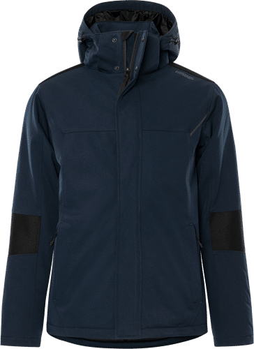 Partly recycled material / Windproof and water repellent / Outer fabric of 4-way stretch material / Reinforcement on shoulders and sleeves / Quilted lining / Detachable and adjustable hood / Fleece-lined collar / Front placket opening with zip to top of collar and concealed snap fastening / Concealed vertical zip pocket | accessible when garment is closed / 2 front pockets with zip / 2 inside pockets with zip / Inside pocket in mesh / Rib-knit inner cuff at sleeve end / Adjustable drawstring at bottom / Reflective detail / Extended back / Zip in lining for transfer / Waterpillar > 3 | 000 mm / Approved according to EN 342 / OEKO-TEX® certified.